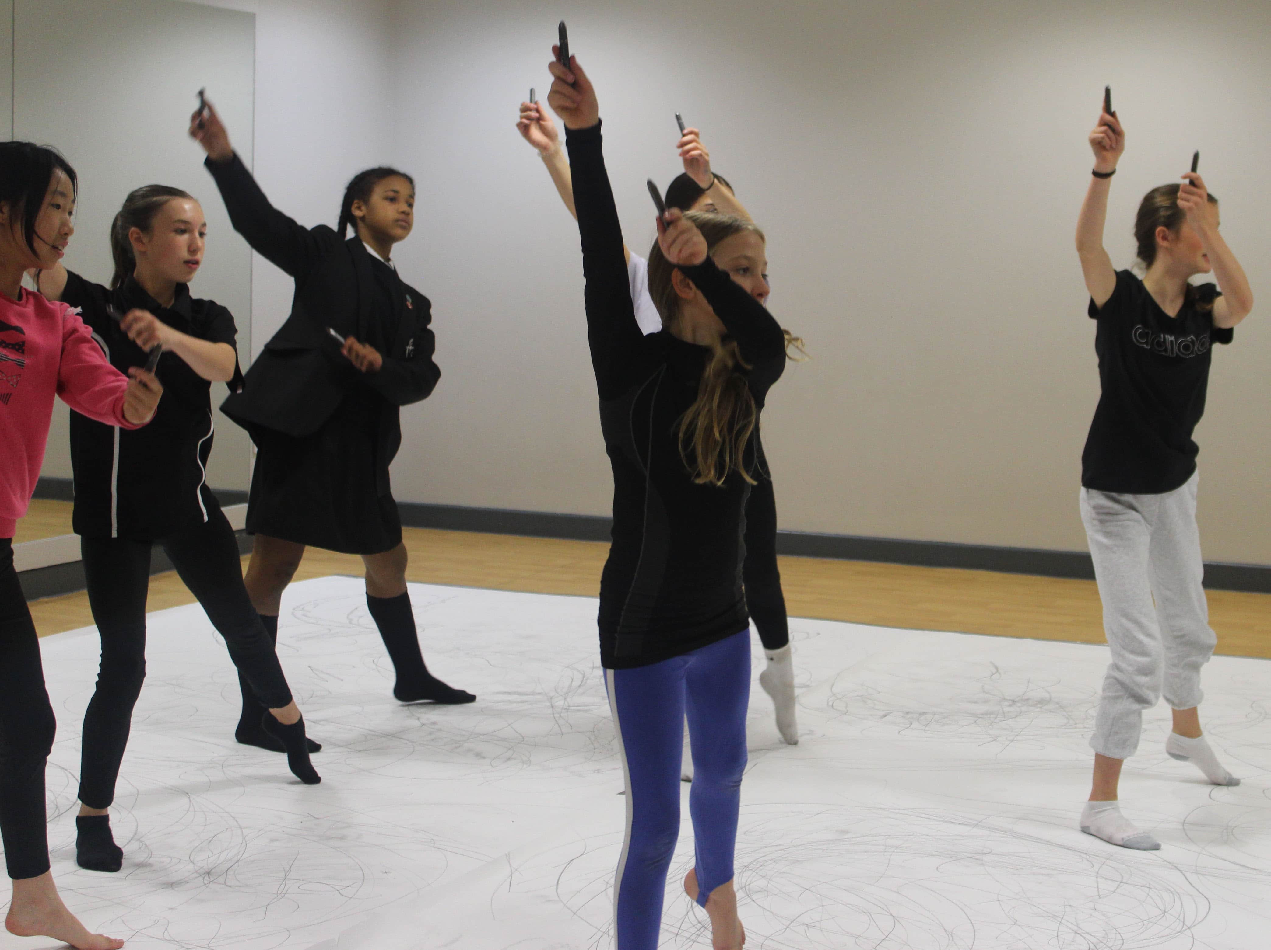In the Dance Drawing workshop, students created a physical response to music through choreographed movement with a range of art materials.